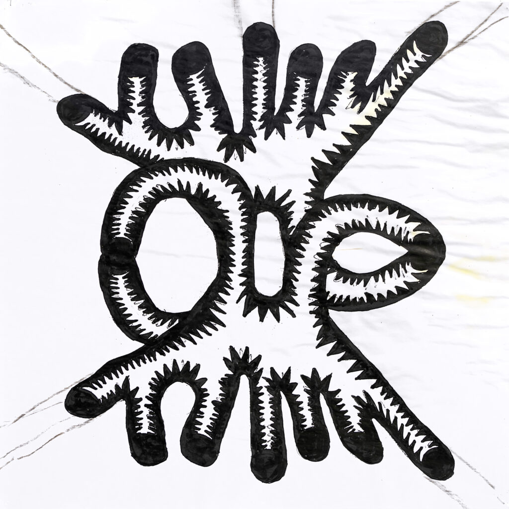 Une forme abstraite, stylisée en noir et blanc sur un fond blanc. Des structures organiques, rappelant des tentacules ou des racines, se croisent et se connectent, formant une composition complexe et asymétrique. Des motifs répétitifs et des détails fins, comme des dents ou des spirales, ornent les contours des structures. La perspective est directe, sans profondeur particulière. Le style est artisanal et évoque un dessin ou une esquisse. L’ambiance est neutre, sans émotion particulière.